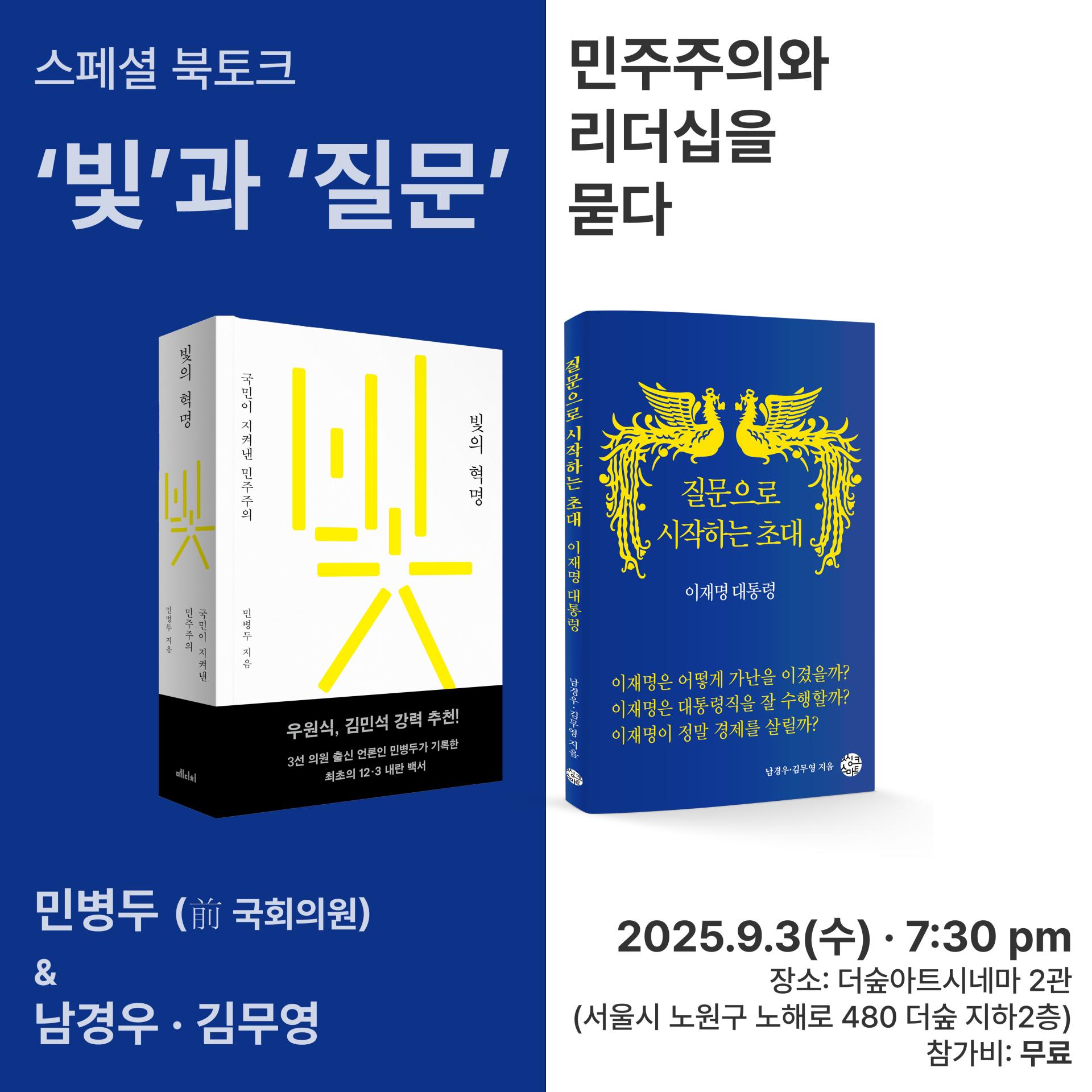 이번 북토크에는 민병두 전 국회의원, 남경우 작가, 김무영 작가가 함께합니다. 두 책이 담은 문제의식과 경험을 통해, 우리가 서 있는 민주주의의 현재와 앞으로의 리더십에 대해 함께 질문하고 토론하는 시간이 될 것입니다.