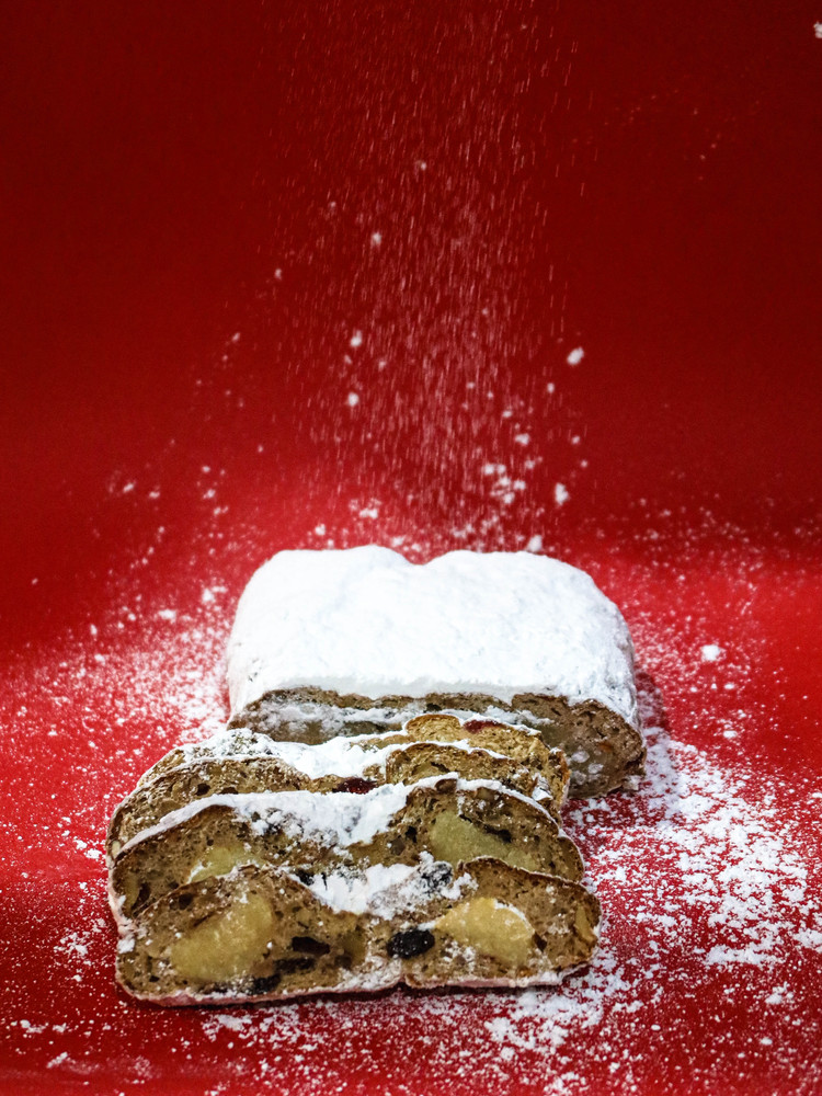 1년간 럼주에 숙성한 열대과일·시트러스 필·베리류와 통아몬드/슬라이스 아몬드/호두를 사용하고, 유기농 밀가루 반죽 속에 마지팬 두 줄을 담아 촉촉한 단맛을 더했습니다.